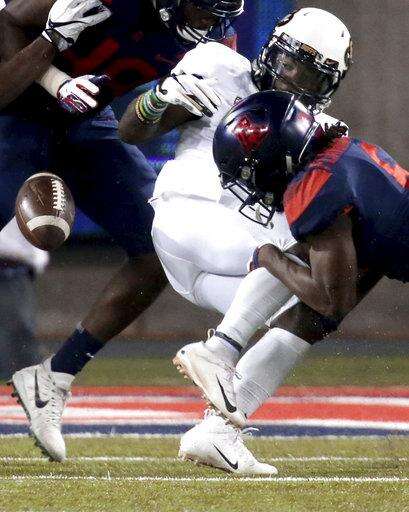 Arizona safety Demetrius Flannigan-Fowles (6) knocks the ball out of the hands of Colorado wide receiver K.D. Nixon, stopping him on fourth and short during the first quarter of an NCAA college football game Friday, Nov. 2, 2018, in Tucson, Ariz. (Kelly Presnell/Arizona Daily Star via AP) The Associated Press