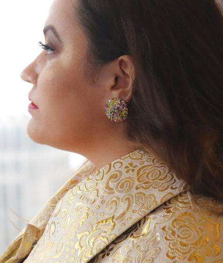 Until then, for fall, we caught up with all things Barbie x Unique Vintage in the swanky Jewel Suite designed by jeweler-to-the-stars Martin Katz in the Lotte New York Palace hotel on Madison Avenue. Katz paired a few of the looks with some of his own bling, from $36,000 button earrings in a rainbow of sapphires, garnets and tourmaline to a $48,000 cocktail ring of Bombay spinel cabochons and round diamonds.