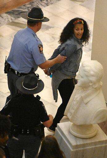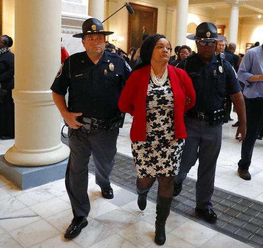 Sen. Nikema Williams, an Atlanta Democrat, was one of 15 people arrested as dozens gathered in the second-floor rotunda of the statehouse loudly chanting "Count the votes!" and waving signs with the same slogan. Police zip-tied Williams' hands behind her back and led her from the Capitol to one of two vans holding other arrested protesters.