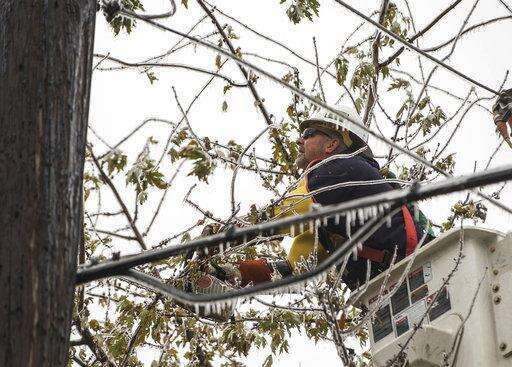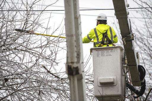 Russell Kennedy, with Townsend, trims ice laden tree branches from power lines in Candlelight Village after an ice storm in Columbus, Ind., Thursday, Nov. 15, 2018. An ice storm that hit Bartholomew County caused power outages and school closures. (Mike Wolanin/The Republic via AP)