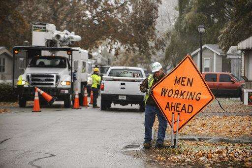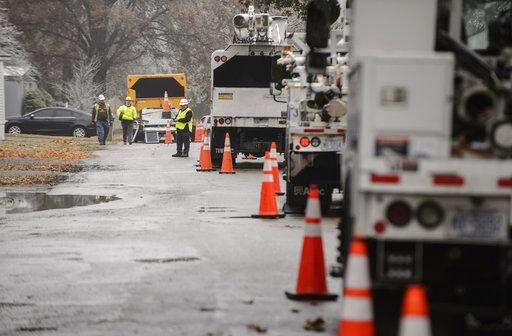 Electric crews begin work to restore power in Candlelight Village after an ice storm in Columbus, Ind., Thursday, Nov. 15, 2018. An ice storm that hit Bartholomew County caused power outages and school closures. (Mike Wolanin/The Republic via AP)