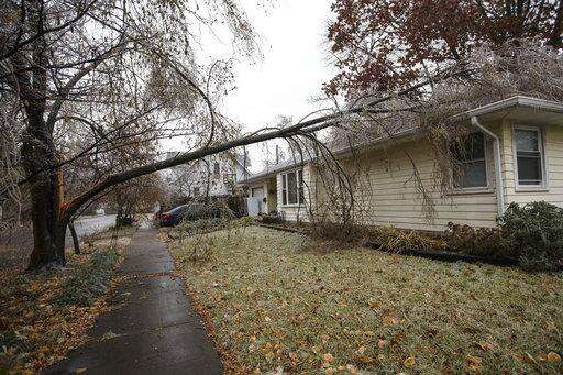 A downed tree rests on a the roof of a house in Columbus, Ind., Thursday, Nov. 15, 2018. An ice storm that hit Bartholomew County caused power outages and school closures. (Mike Wolanin/The Republic via AP)