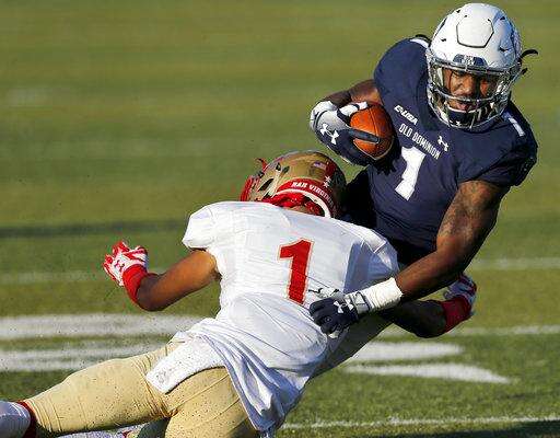 NORFOLK, Va. (AP) - Matt Geiger scored three touchdowns, Kesean Strong and Jeremy Cox each scored two touchdowns and Old Dominion beat VMI 77-14 on Saturday.