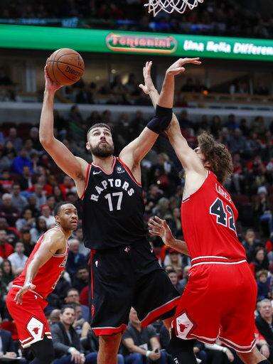 Toronto Raptors center Jonas Valanciunas (17) shoots against Chicago Bulls center Robin Lopez (42) during the first half of an NBA basketball game, Saturday, Nov. 17, 2018, in Chicago. (AP Photo/Kamil Krzaczynski) The Associated Press