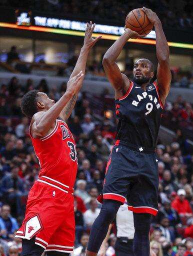Toronto Raptors forward Serge Ibaka (9) shoots as Chicago Bulls forwards Justin Holiday (7) and Jabari Parker (2) defend during the second half of an NBA basketball game Saturday, Nov. 17, 2018, in Chicago. (AP Photo/Kamil Krzaczynski) The Associated Press