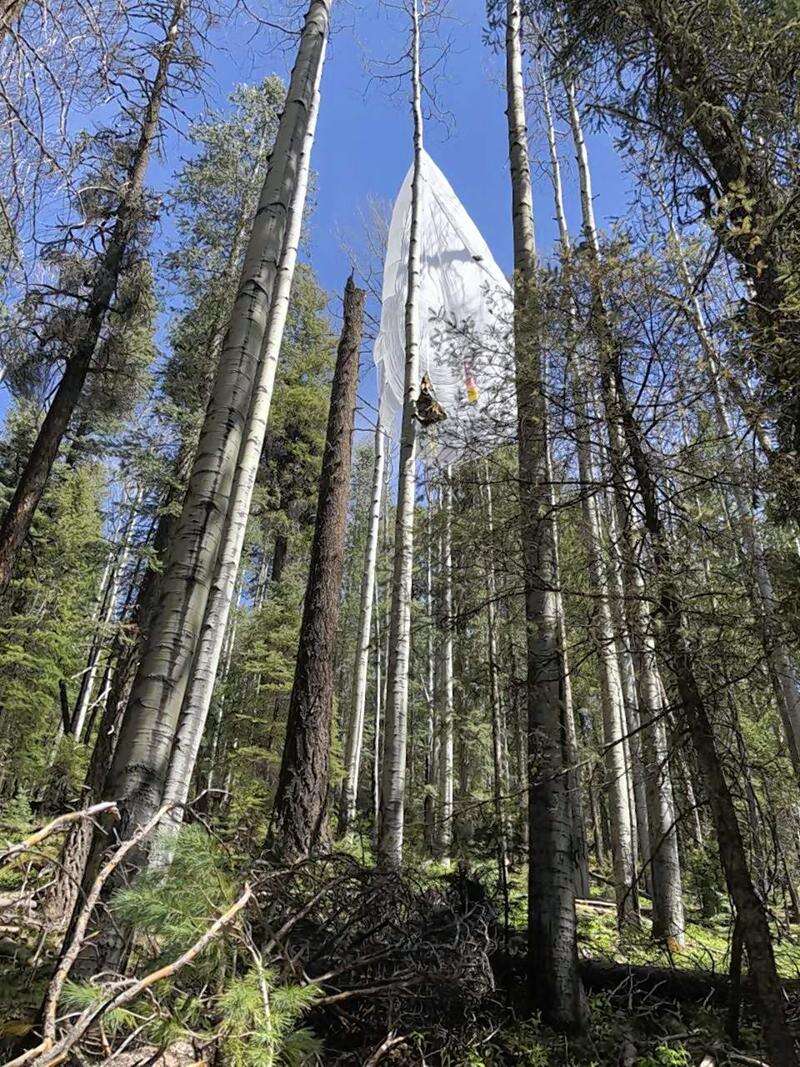 Ken Franzese's parachute is shown here stuck in a tree more than 30 feet above ground after he jumped out of a plane that crashed May 6 in Arizona. Courtesy Ken Franzese