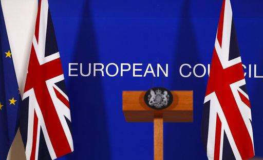 British flags frame a lectern set for a media conference by British Prime Minister Theresa May in Brussels, Sunday, Nov. 25, 2018. European Union gathered on Sunday to seal an agreement on Britain's departure from the bloc next year, the first time a member country will have left the 28-nation bloc. (AP Photo/Alastair Grant) The Associated Press