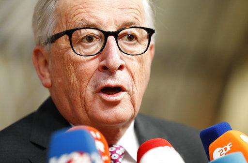 European Commission President Jean-Claude Juncker speaks with the media as he arrives for an EU summit at the Europa building in Brussels, Sunday, Nov. 25, 2018. European Union leaders are gathering to seal an agreement on Britain's departure from the bloc next year, the first time a member country will have left the 28-nation bloc. (AP Photo/Alastair Grant) The Associated Press