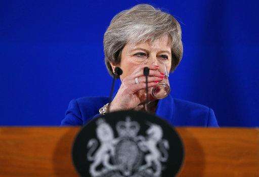 British Prime Minister Theresa May drinks from a glass during a media conference in Brussels, Sunday, Nov. 25, 2018. European Union gathered on Sunday to seal an agreement on Britain's departure from the bloc next year, the first time a member country will have left the 28-nation bloc. (AP Photo/Alastair Grant) The Associated Press