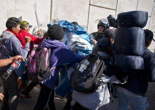 Migrants push past Mexican police at the Chaparral border crossing in Tijuana, Mexico, Sunday, Nov. 25, 2018, as they try to reach the United States. The mayor of Tijuana has declared a humanitarian crisis in his border city and says that he has asked the United Nations for aid to deal with the approximately 5,000 Central American migrants who have arrived in the city. (AP Photo/Ramon Espinosa)