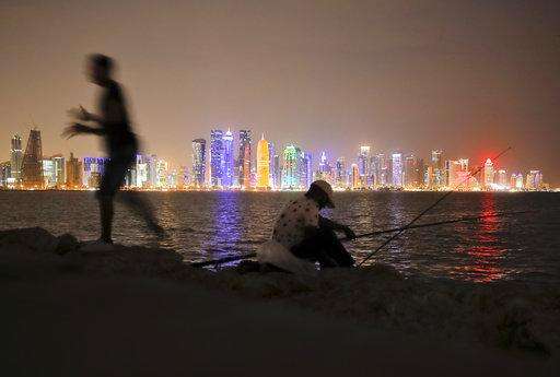 In this Nov. 2, 2018 picture men fish, backdropped by the city skyline Doha, Qatar. Eight stadiums scattered in a 30-mile radius that will host 32 teams from across the planet are in various stages of development, most of them trying to walk the treacherous line of paying homage to the region's history while simultaneously avoiding becoming an expensive and unused relic once the party ends and everyone else goes home. (AP Photo/Vadim Ghirda) The Associated Press