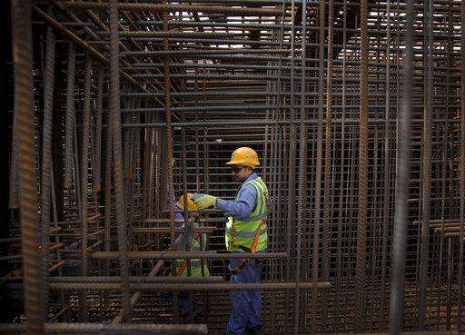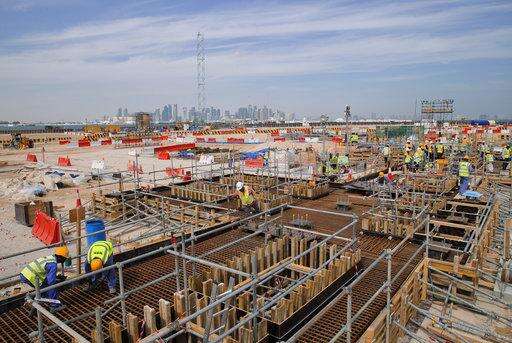 In this Wednesday, Oct. 31, 2018 picture, men install foundation steel reinforcement bars on the construction site of the Ras Abu Aboud stadium in Doha, Qatar. Eight stadiums scattered in a 30-mile radius that will host 32 teams from across the planet are in various stages of development, most of them trying to walk the treacherous line of paying homage to the region's history while simultaneously avoiding becoming an expensive and unused relic once the party ends and everyone else goes home.(AP Photo/Vadim Ghirda) The Associated Press