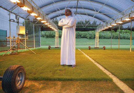 In this Wednesday, Oct. 31, 2018 picture, Yasser Al Mulla - Landscape and Sport Turf Management Senior Manager, Competition Venues, speaks during an interview with the Associated Press in Doha, Qatar. Al-Mulla oversees a turf farm a few miles west of the city center, where he's tested 36 different kinds of grass, exposing them to various amounts of shade, sunlight and other forms of treatment to see what works and what doesn't.(AP Photo/Vadim Ghirda) The Associated Press