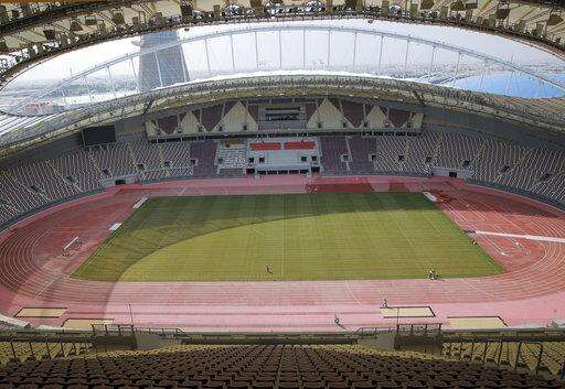 In this Wednesday, Oct. 31, 2018 picture men perform modernization work on the Khalifa International Stadium in Doha, Qatar. Eight stadiums scattered in a 30-mile radius that will host 32 teams from across the planet are in various stages of development, most of them trying to walk the treacherous line of paying homage to the region's history while simultaneously avoiding becoming an expensive and unused relic once the party ends and everyone else goes home. (AP Photo/Vadim Ghirda) The Associated Press