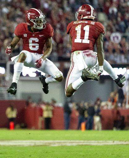 FILE - In this Saturday, Nov. 24, 2018, file photo, Alabama wide receivers DeVonta Smith (6) and Henry Ruggs III (11) celebrate a touchdown reception by Ruggs during the second half of an NCAA college football game against Auburn in Tuscaloosa, Ala. The Tide hasn't had a Top 15 offense under coach Nick Saban. Enter Tua Tagovailoa. And Jerry Jeudy. And fellow receivers Henry Ruggs III, DeVonta Smith and freshman Jaylen Waddle. Plus tight end Irv Smith Jr. Not to mention tailbacks Damien Harris, Najee Harris and Josh Jacobs. (AP Photo/Vasha Hunt, File)