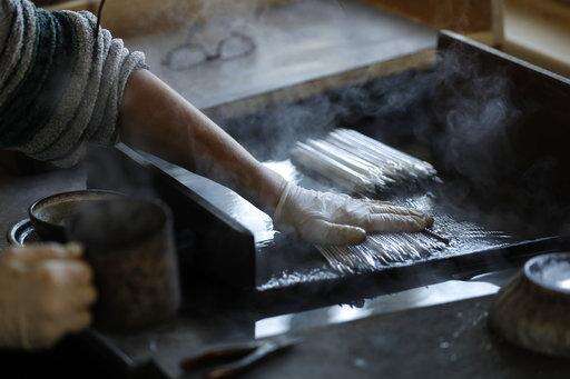 In this picture taken on Wednesday, Nov. 28, 2018, a traditional worker colours small blown glass beads for Christmas decorations in the village of Ponikla, Czech Republic. The small family business in a mountainous village in northern Czech Republic is the last place in the world where traditional Christmas decorations are made from glass beads blown and painted by hand. (AP Photo/Petr David Josek)