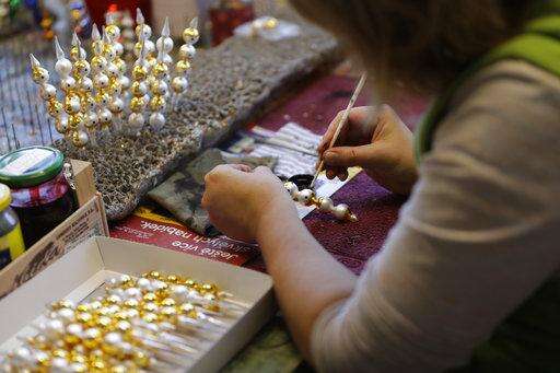 In this picture taken on Wednesday, Nov. 28, 2018, a traditional worker hand paints small blown glass beads for Christmas decorations in the village of Ponikla, Czech Republic. The small family business in a mountainous village in northern Czech Republic is the last place in the world where traditional Christmas decorations are made from glass beads blown and painted by hand. (AP Photo/Petr David Josek)