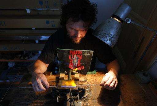 In this picture taken on Wednesday, Nov. 28, 2018, Marek Kulhavy blows small glass beads in the village of Ponikla, Czech Republic. A small family business in a mountainous village in northern Czech Republic is the last place where traditional Christmas decorations from blown glass beads are made. (AP Photo/Petr David Josek)