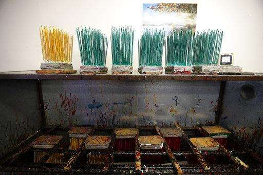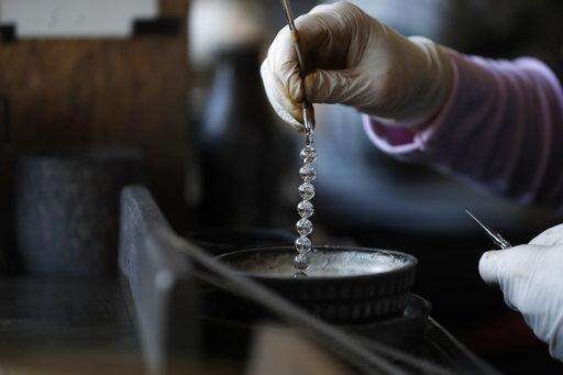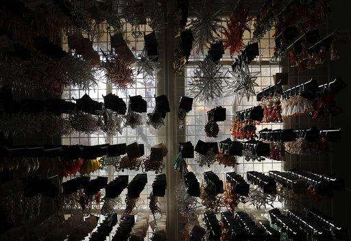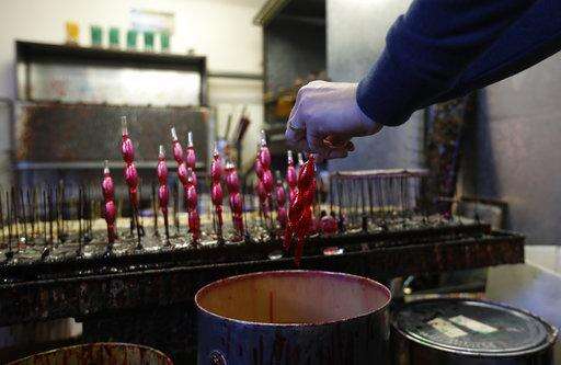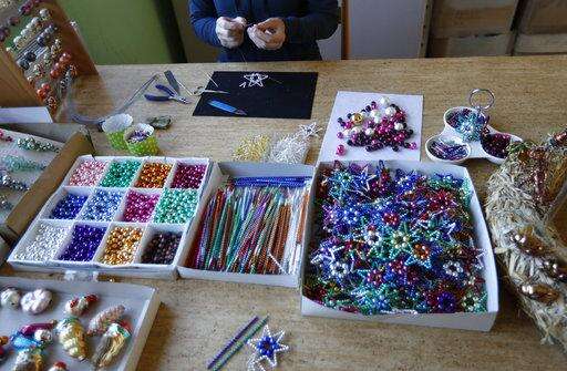 In this picture taken on Wednesday, Nov. 28, 2018, small blown glass beads are placed to dry during the manufacturing process to make traditional Christmas decorations in the village of Ponikla, Czech Republic. The small family business in a mountainous village in northern Czech Republic is the last place in the world where traditional Christmas decorations are made from glass beads blown and painted by hand. (AP Photo/Petr David Josek)