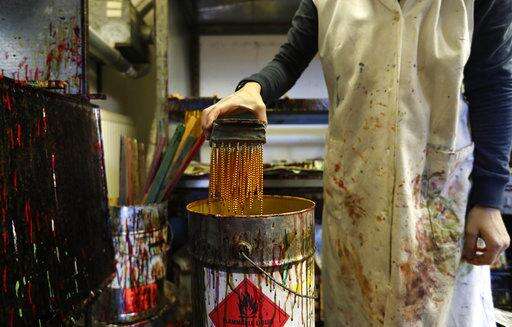 In this picture taken on Wednesday, Nov. 28, 2018, a worker colours small blown glass beads in the village of Ponikla, Czech Republic. The small family business in a mountainous village in northern Czech Republic is the last place in the world where traditional Christmas decorations are made from glass beads blown and painted by hand. (AP Photo/Petr David Josek)