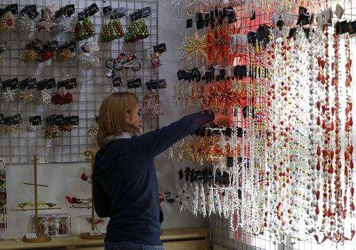 In this picture taken on Wednesday, Nov. 28, 2018, a worker adjusts the shop display of traditional blown glass Christmas decorations in the village of Ponikla, Czech Republic. The small family business in a mountainous village in northern Czech Republic is the last place in the world where traditional Christmas decorations are made from glass beads blown and painted by hand. (AP Photo/Petr David Josek)