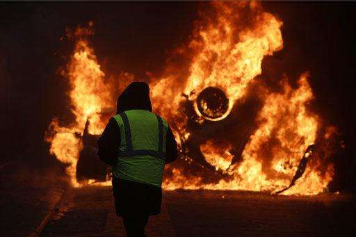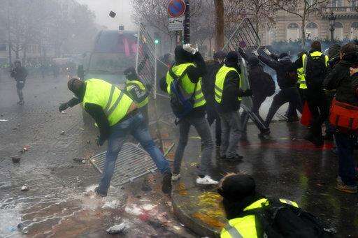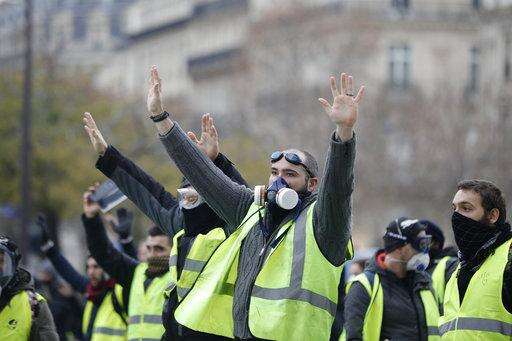 Most of the protesters, called "yellow jackets" for the fluorescent vests they wear, were peaceful. But others mixed in with them wore black hoodies and piled up construction materials, including large plywood planks, in the middle of a street near the Arc de Triomphe, and set the rubble on fire.