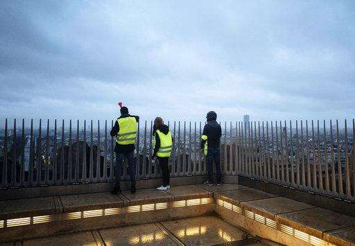 Demonstrators watch from the top of the Arc de Triomphe on the Champs-Elysees avenue during a demonstration Saturday, Dec.1, 2018 in Paris. Demonstrations against rising taxes turned into scenes of rioting in Paris city center as at least 65 people including 11 police officers have been injured in violent protests in the French capital. (AP Photo/Kamil Zihnioglu)