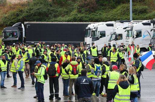 Demonstrators block truck son the motorway in Biarritz, southwestern France, Saturday, Dec.1, 2018. French authorities have deployed thousands of police on Paris' Champs-Elysees avenue to try to contain protests which began with motorists demonstrating against a fuel tax hike, but now involve a broad range of demands related to the country's high cost of living. (AP Photo/Bob Edme)