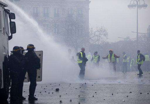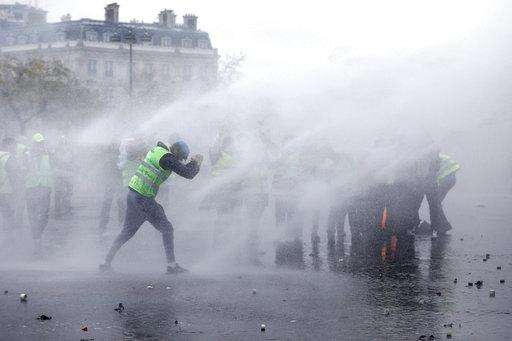 Demonstrators wearing yellow jackets face water cannons near the Champs-Elysees avenue during a demonstration Saturday, Dec.1, 2018 in Paris. French authorities have deployed thousands of police on Paris' Champs-Elysees avenue to try to contain protests by people angry over rising taxes and Emmanuel Macron's presidency. (AP Photo/Kamil Zihnioglu)