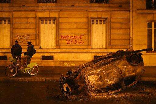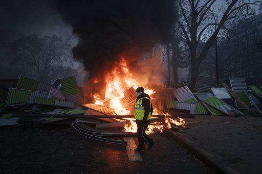 PARIS (AP) - France's most violent urban riot in a decade engulfed central Paris on Saturday as "yellow jacket" activists torched cars, smashed windows, looted stores and tagged the Arc de Triomphe with multi-colored graffiti.