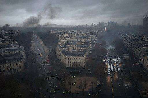 Demonstrators are pictured from the top of the Arc de Triomphe on the Champs-Elysees avenue during a demonstration Saturday, Dec.1, 2018 in Paris. Demonstrations against rising taxes turned into scenes of rioting in Paris city center as at least 65 people including 11 police officers have been injured in violent protests in the French capital. (AP Photo/Kamil Zihnioglu)