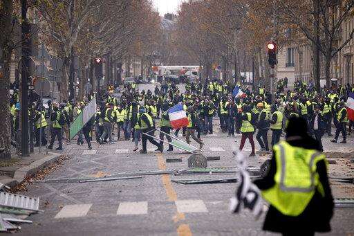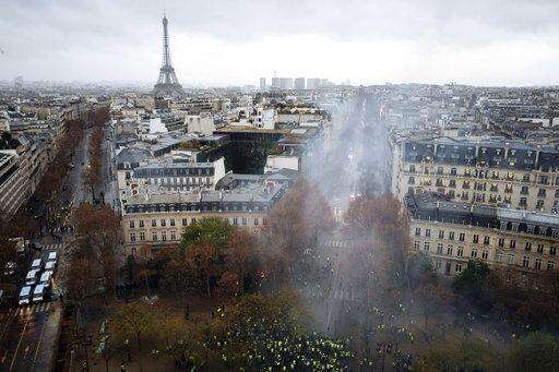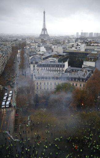 Demonstrators attend a demonstration near the Arc de Triomphe, Saturday, Dec.1, 2018 in Paris. A French protest against rising taxes and the high cost of living turned into a riot Saturday in Paris as police fired tear gas and water cannon in street battles with activists wearing the fluorescent yellow vests of a new movement. (AP Photo/Kamil Zihnioglu)