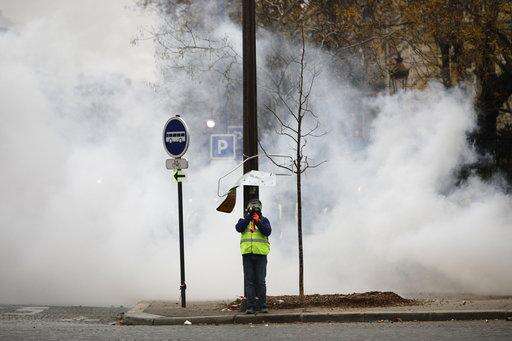 A demonstrator uses his phone amid tear gas near the Champs-Elysees avenue during a demonstration Saturday, Dec.1, 2018 in Paris. French authorities have deployed thousands of police on Paris' Champs-Elysees avenue to try to contain protests by people angry over rising taxes and Emmanuel Macron's presidency. (AP Photo/Kamil Zihnioglu)