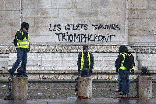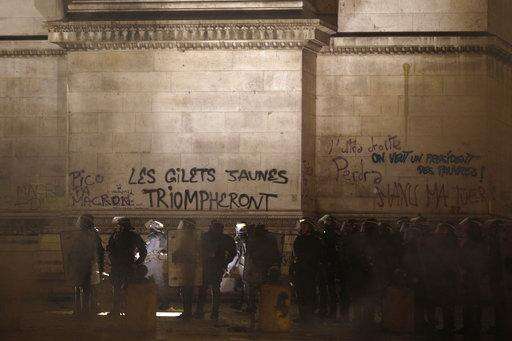 Demonstrators stand by the words "yellow jackets will triumph" written in black letters at the base of the Arc de Triomphe during a demonstration Saturday, Dec.1, 2018 in Paris. Paris police say at least 63 people have been arrested in violent clashes between protesters and police amid nationwide demonstrations against rising taxes and President Emmanuel Macron's policies. (AP Photo/Thibault Camus)