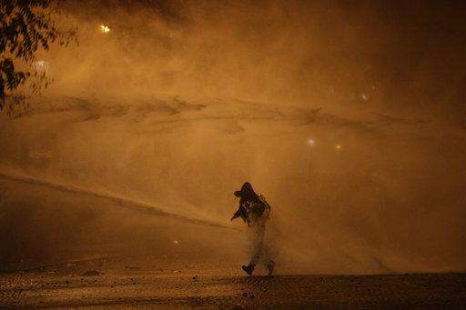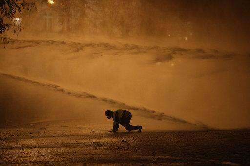 A demonstrator leaves as water cannons evacuate the Place de l'Etoile, near the Arc de Triomphe, Saturday, Dec.1, 2018 in Paris. A French protest against rising taxes and the high cost of living turned into a riot Saturday in Paris as police fired tear gas and water cannon in street battles with activists wearing the fluorescent yellow vests of a new movement. (AP Photo/Kamil Zihnioglu)