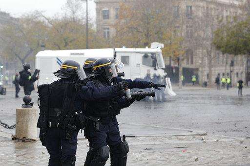 French television showed police leading a shaken woman away from the protesters, and loud bangs rang out near the famed Champs Elysees Avenue where the violence was centered.