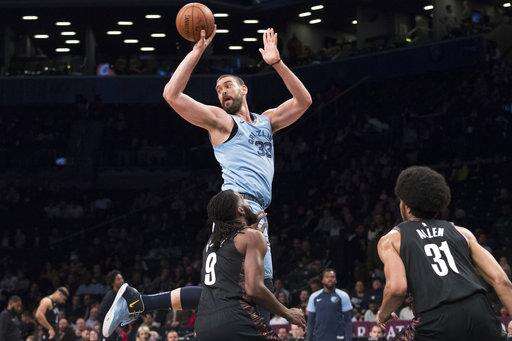 Memphis Grizzlies center Marc Gasol (33) passes the ball as Brooklyn Nets forward DeMarre Carroll (9) and center Jarrett Allen (31) defend during the first half of an NBA basketball game Friday, Nov. 30, 2018, in New York. (AP Photo/Mary Altaffer)