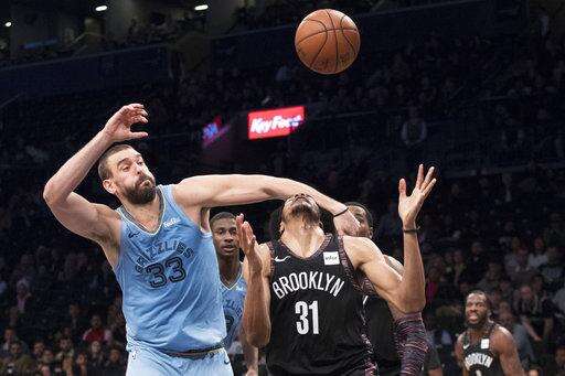 Memphis Grizzlies center Marc Gasol (33) and Brooklyn Nets center Jarrett Allen (31) vie for a rebound during overtime in an NBA basketball game Friday, Nov. 30, 2018, in New York. The Grizzlies won 131-125. (AP Photo/Mary Altaffer)