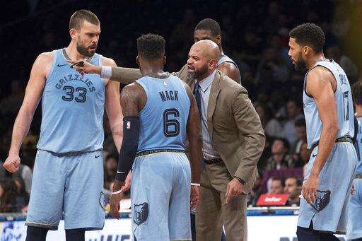 Memphis Grizzlies head coach J.B. Bickerstaff talks to his team during overtime in the team's NBA basketball game against the Brooklyn Nets, Friday, Nov. 30, 2018, in New York. The Grizzlies won 131-125. (AP Photo/Mary Altaffer)