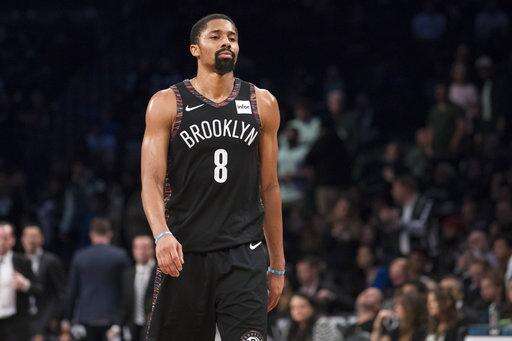 Brooklyn Nets guard Spencer Dinwiddie walk along the court near the end of the team's NBA basketball game against the Memphis Grizzlies, Friday, Nov. 30, 2018, in New York. The Grizzlies won 131-125 in two overtimes. (AP Photo/Mary Altaffer)