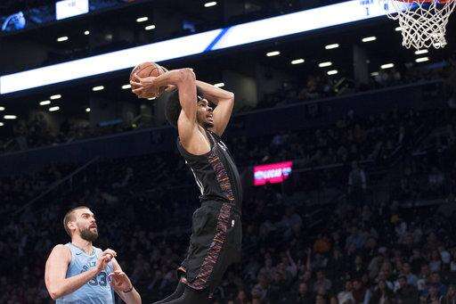 Brooklyn Nets center Jarrett Allen dunks past Memphis Grizzlies center Marc Gasol during the second half of an NBA basketball game Friday, Nov. 30, 2018, in New York. The Grizzlies won 131-125 in two overtimes. (AP Photo/Mary Altaffer)