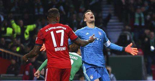 Serge Gnabry's two goals were enough for Bayern to end its three-game run without a win. The six-time defending champion was holding on at the end, though, despite Bremen's Niklas Moisander being sent off in second-half injury time.