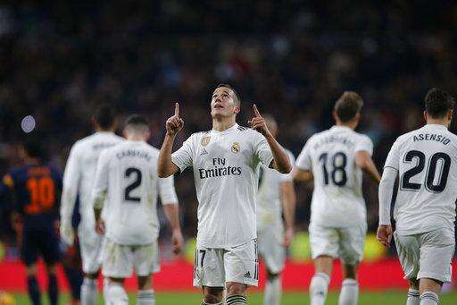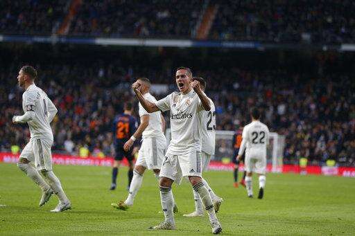 Real Madrid's Lucas Vazquez celebrates after scoring his side's 2nd goal during a Spanish La Liga soccer match between Real Madrid and Valencia at the Santiago Bernabeu stadium in Madrid, Spain, Saturday, Dec. 1, 2018. (AP Photo/Paul White)