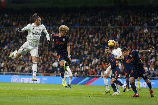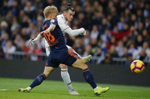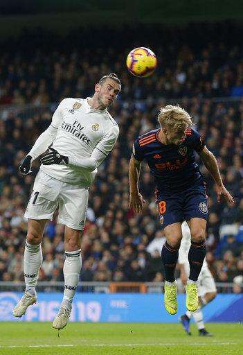 Real Madrid's Gareth Bale, left, heads the ball on goal during a Spanish La Liga soccer match between Real Madrid and Valencia at the Santiago Bernabeu stadium in Madrid, Spain, Saturday, Dec. 1, 2018. (AP Photo/Paul White)