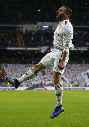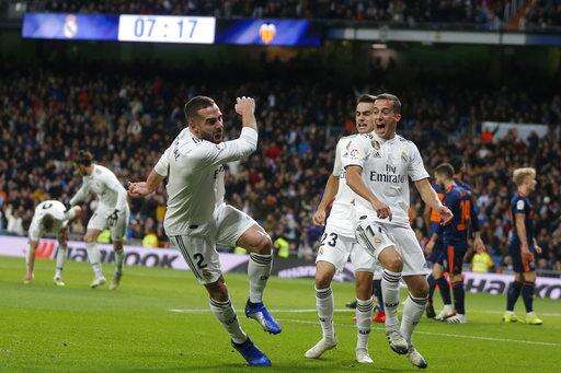 Real Madrid's Dani Carvajal, left, celebrates after Valencia's Daniel Wass scored an own goal during a Spanish La Liga soccer match between Real Madrid and Valencia at the Santiago Bernabeu stadium in Madrid, Spain, Saturday, Dec. 1, 2018. (AP Photo/Paul White)