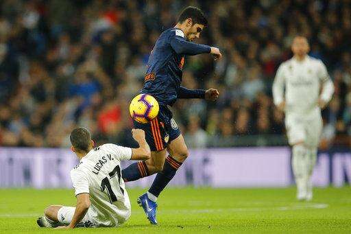 Valencia's Goncalo Guedes, centre, and Real Madrid's Lucas Vazquez vie for the ball during a Spanish La Liga soccer match between Real Madrid and Valencia at the Santiago Bernabeu stadium in Madrid, Spain, Saturday, Dec. 1, 2018. (AP Photo/Paul White)