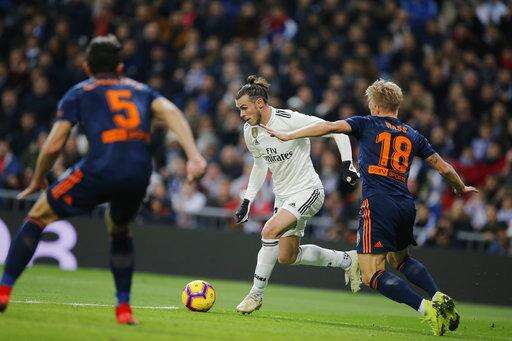 Real Madrid's Gareth Bale, centre, tries to get a cross in during a Spanish La Liga soccer match between Real Madrid and Valencia at the Santiago Bernabeu stadium in Madrid, Spain, Saturday, Dec. 1, 2018. (AP Photo/Paul White)