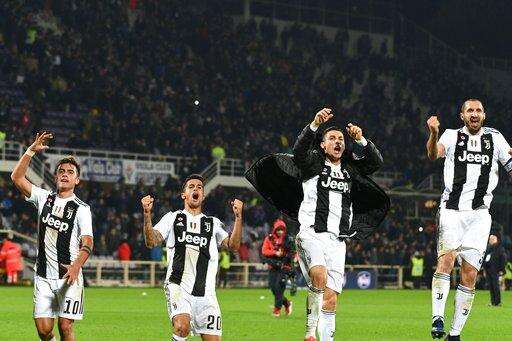 From left, Juventus' Paulo Dybala, Joao Cancelo, Ronaldo and Giorgio Chiellini, celebrate after winning 3 - 0 the Italian Serie A soccer match between Fiorentina and Juventus at the Artemio Franchi stadium in Florence, Italy, Saturday, Dec. 1, 2018. (Claudio Giovannini/ANSA via AP) The Associated Press