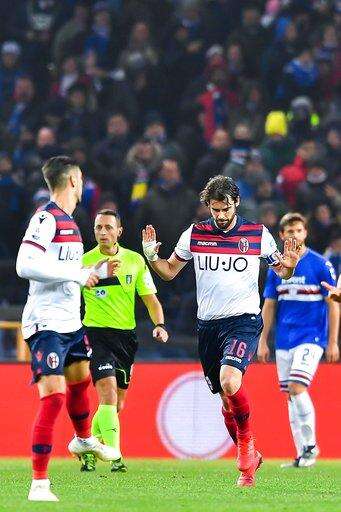 Bologna's Andrea Poli, right, reacts after scoring the goal against Sampdoria, during the Italian Serie A soccer match between Sampdoria and Bologna at the Luigi Ferraris stadium in Genoa, Italy, Saturday, Dec. 1, 2018. (Simone Arveda/ANSA via AP) The Associated Press