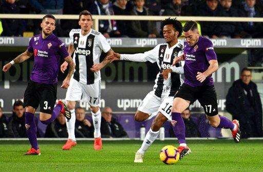Fiorentina midfielder Jordan Veretout, right, and Juventus midfielder Juan Cuadrado vie for the ball during the Italian Serie A soccer match between Fiorentina and Juventus at the Artemio Franchi stadium in Florence, Italy, Saturday, Dec. 1, 2018. (Claudio Giovannini/ANSA via AP) The Associated Press